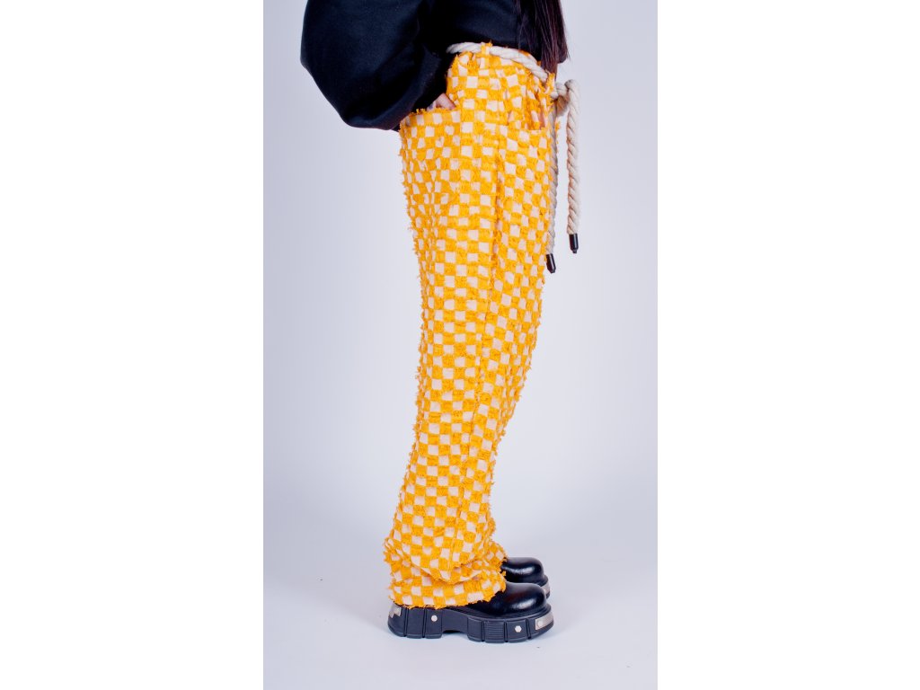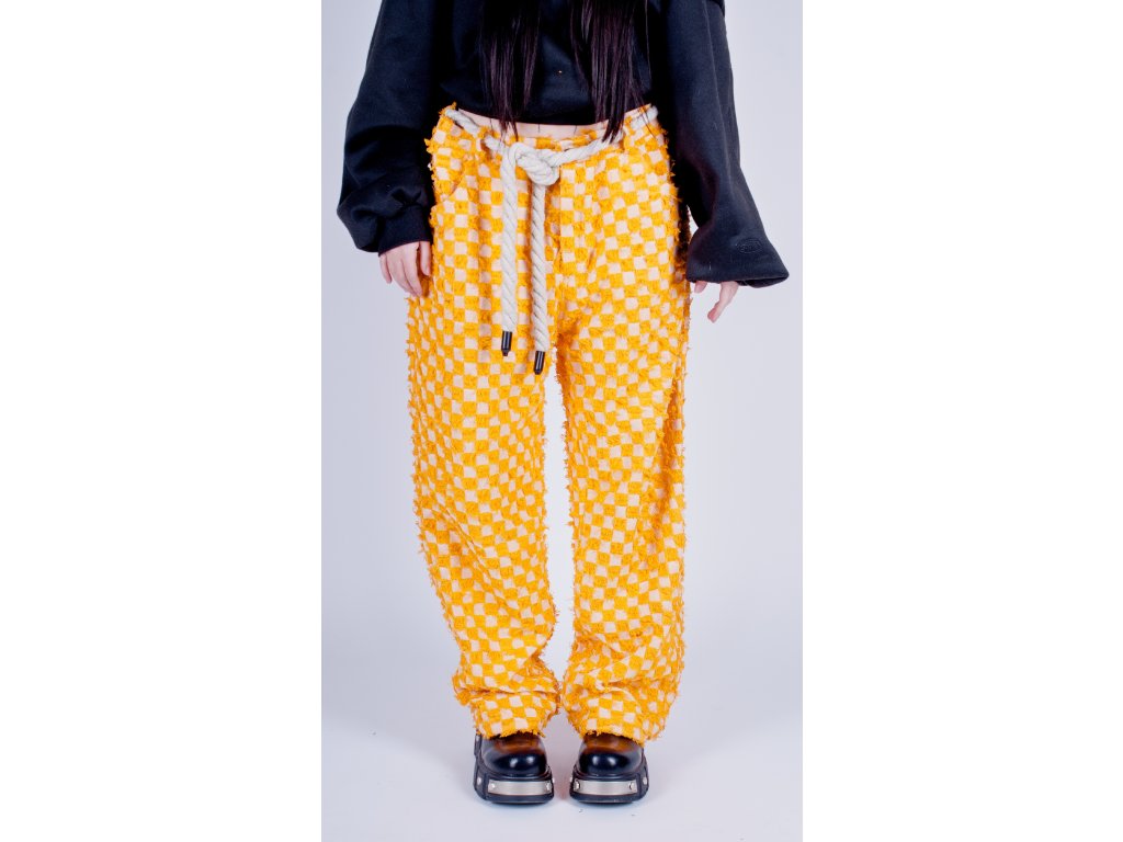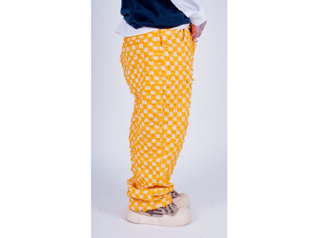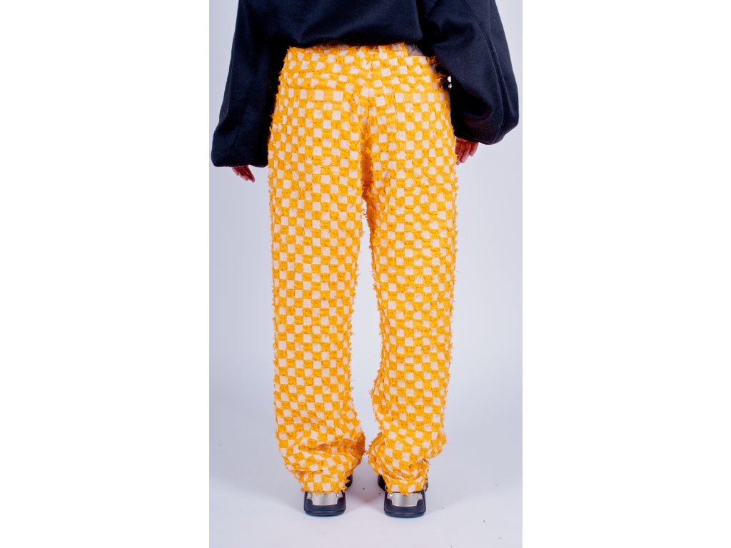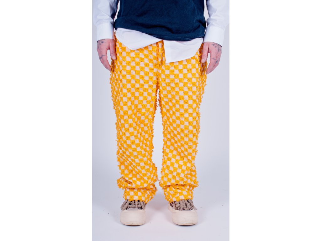 Ručně šité kalhoty vyrobené kompletně v České republice z unikátní džínoviny s kostkovaným vzorem který kombinuje rub a líc látky.