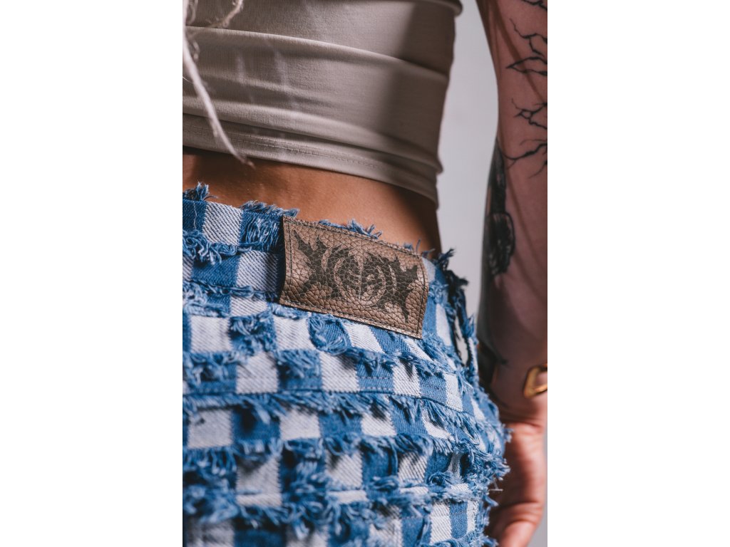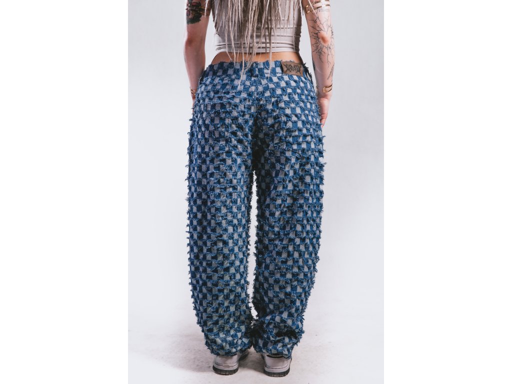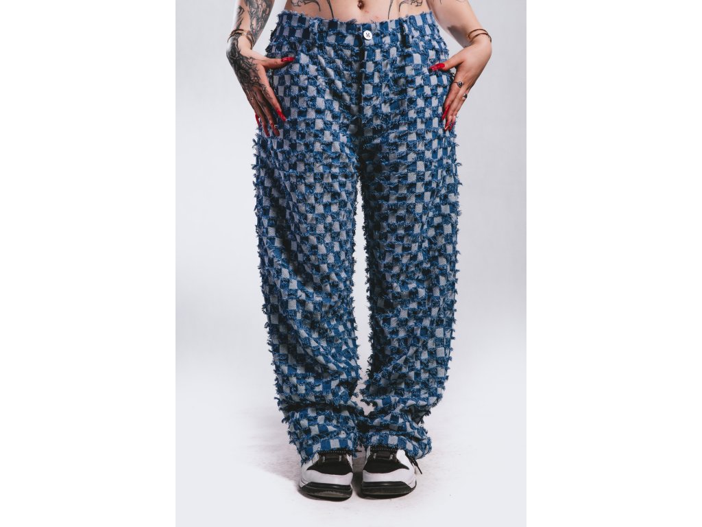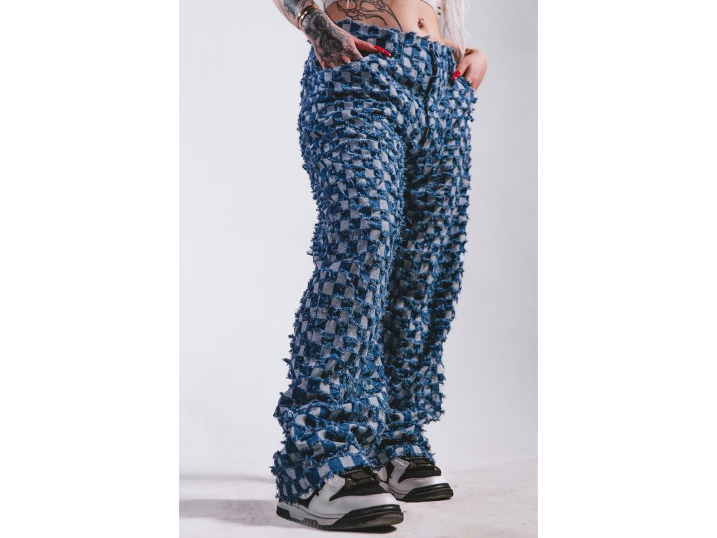 Ručně šité kalhoty vyrobené kompletně v České republice z unikátní džínoviny s kostkovaným vzorem který kombinuje rub a líc látky.
