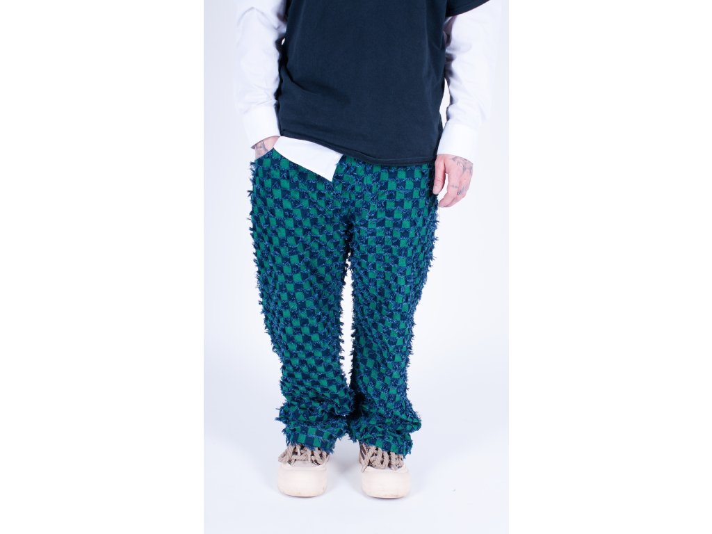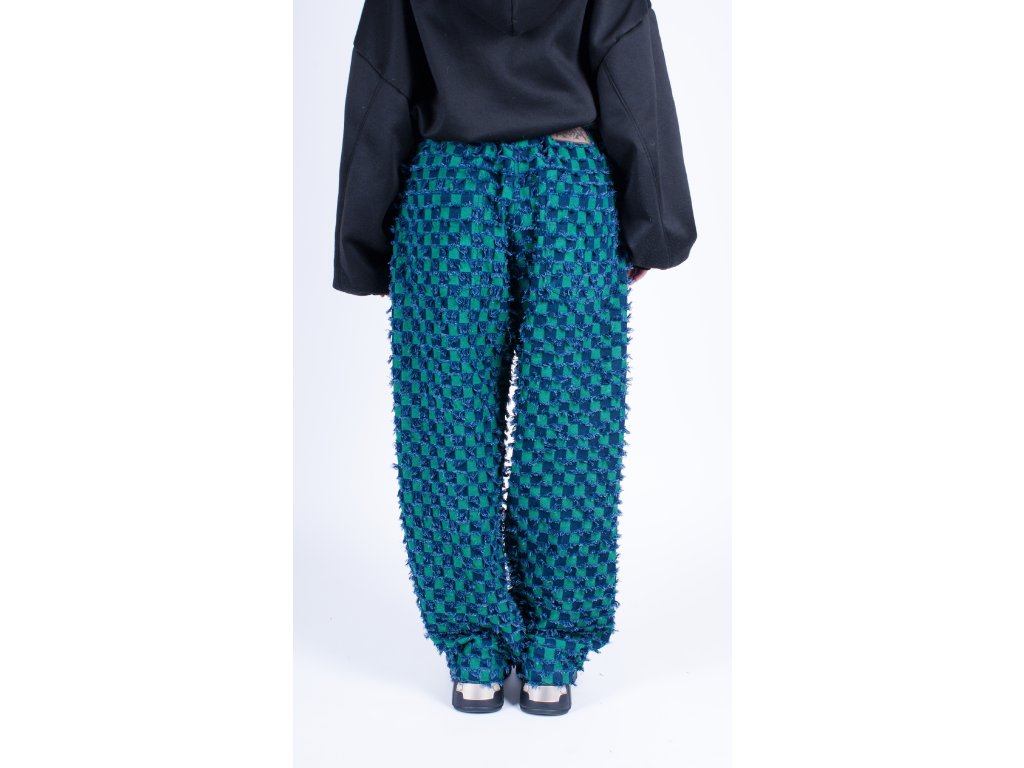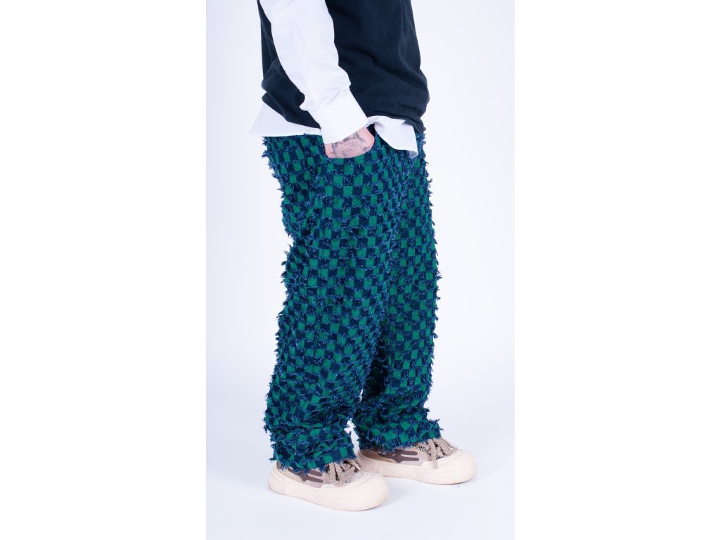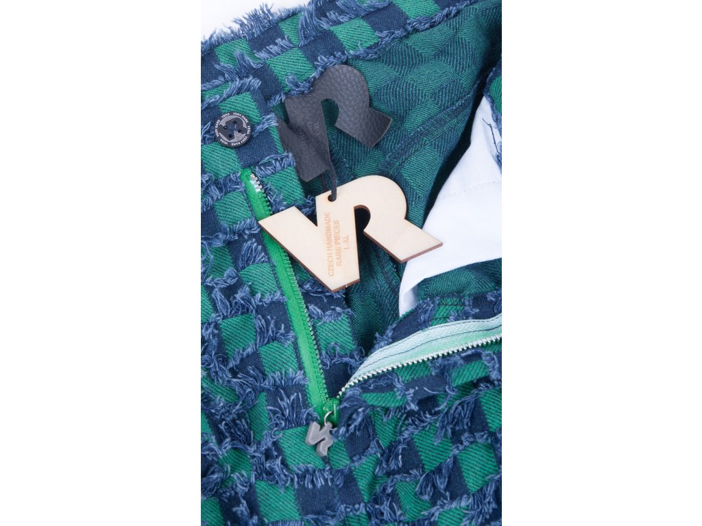Ručně šité kalhoty vyrobené kompletně v České republice z unikátní džínoviny s kostkovaným vzorem který kombinuje rub a líc látky.