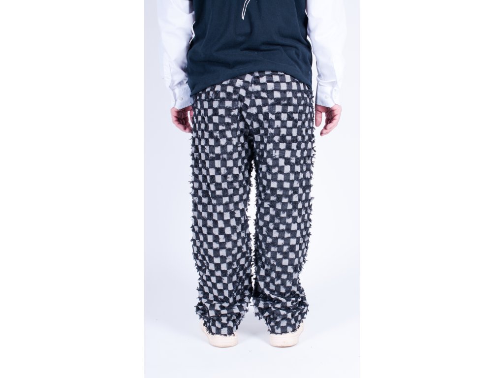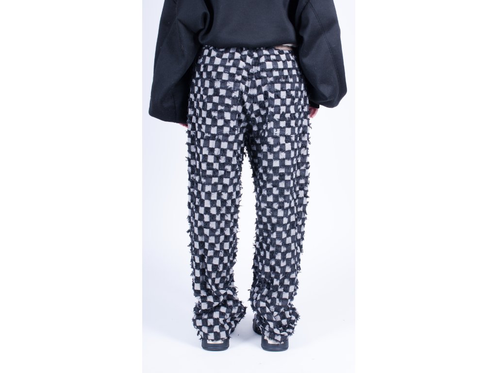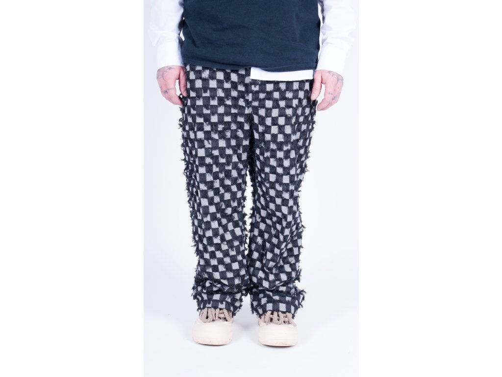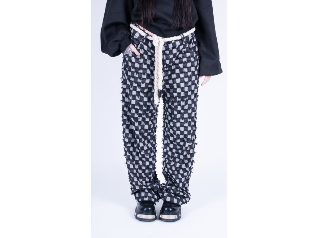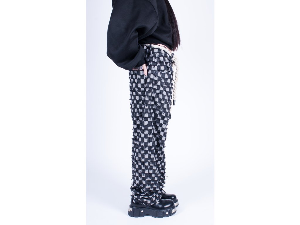 Ručně šité kalhoty vyrobené kompletně v České republice z unikátní džínoviny s kostkovaným vzorem který kombinuje rub a líc látky.
